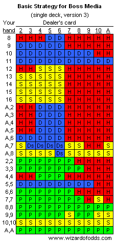 Strategy Card for Boss Media Single Deck Blackjack. Some Boss Media sites offer single deck blackjack. Use this strategy card for those sites. The game has a players advantage of 0.11% using this card. Rules are the same as the six deck game.